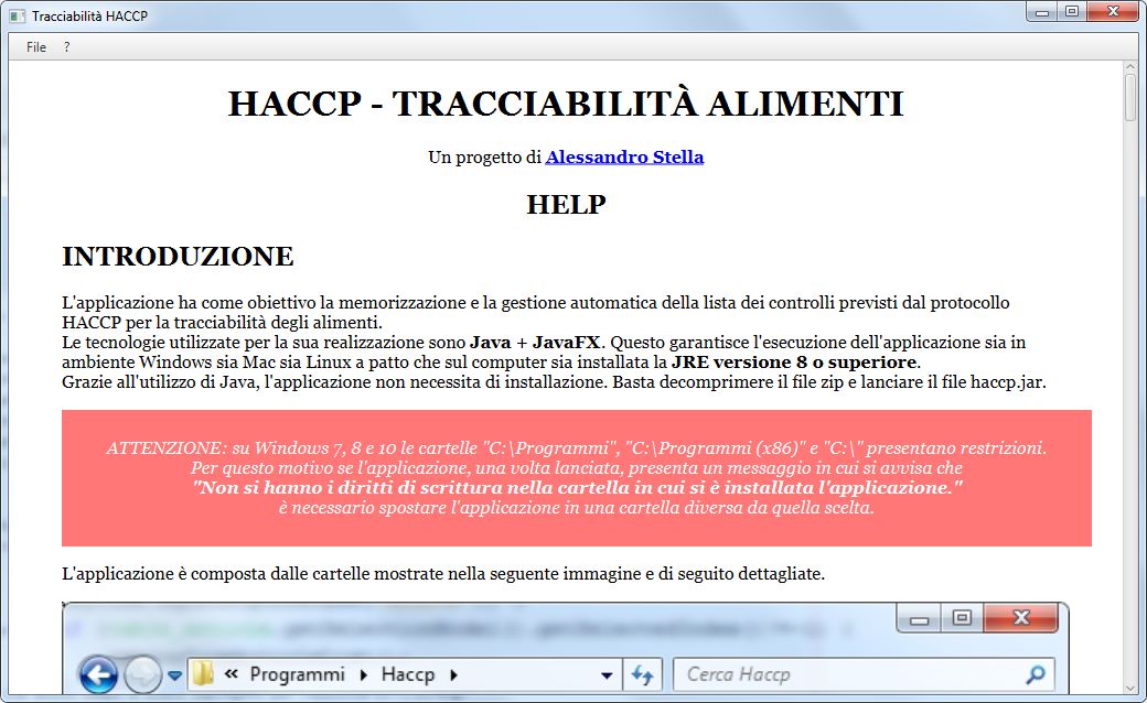 Se si scarica il file zip, basta decomprimerlo in una qualunque cartella e lanciare il file haccp.jar. Se si usa Windows è consigliato scaricare l’eseguibile di installazione.